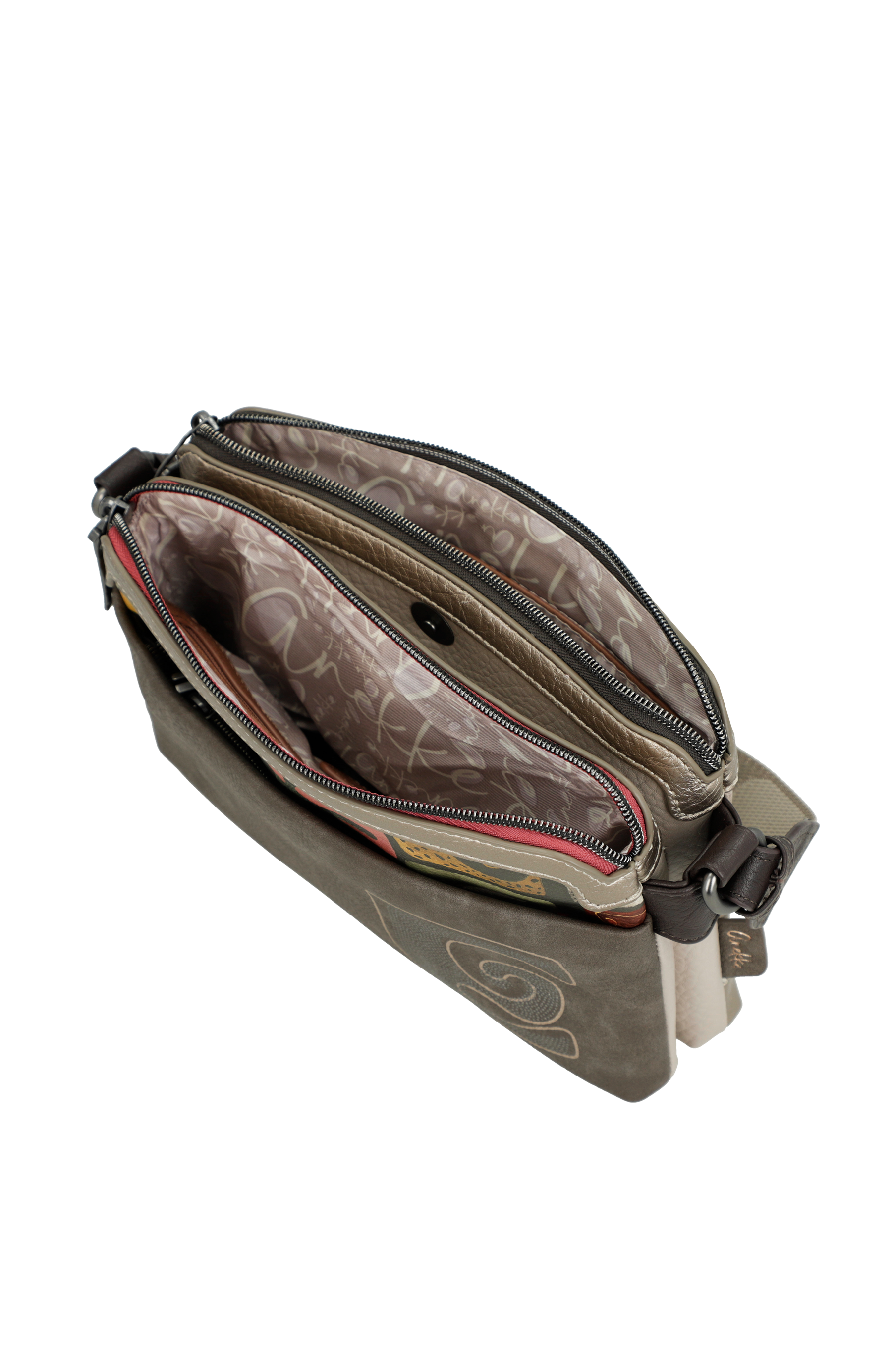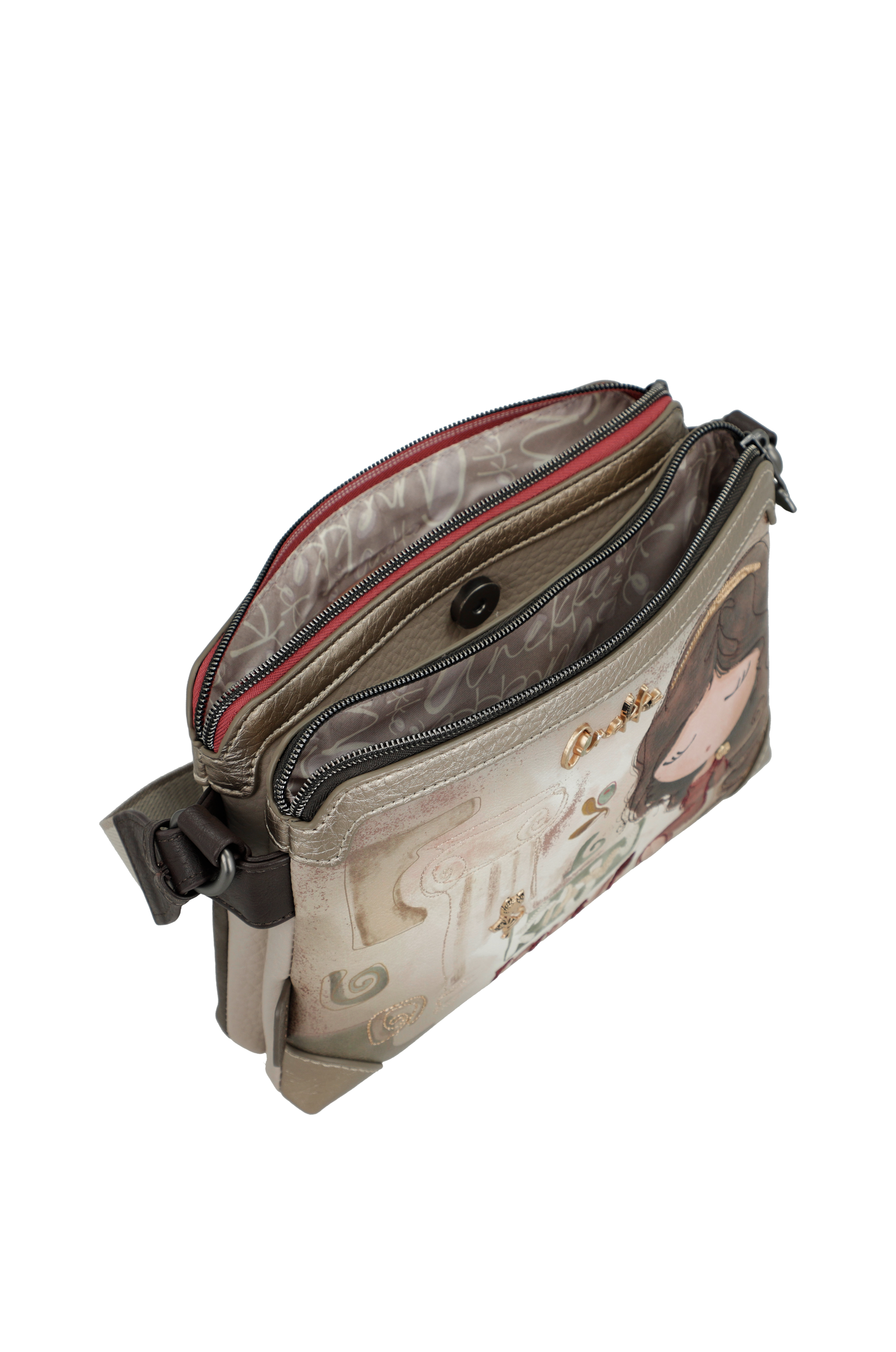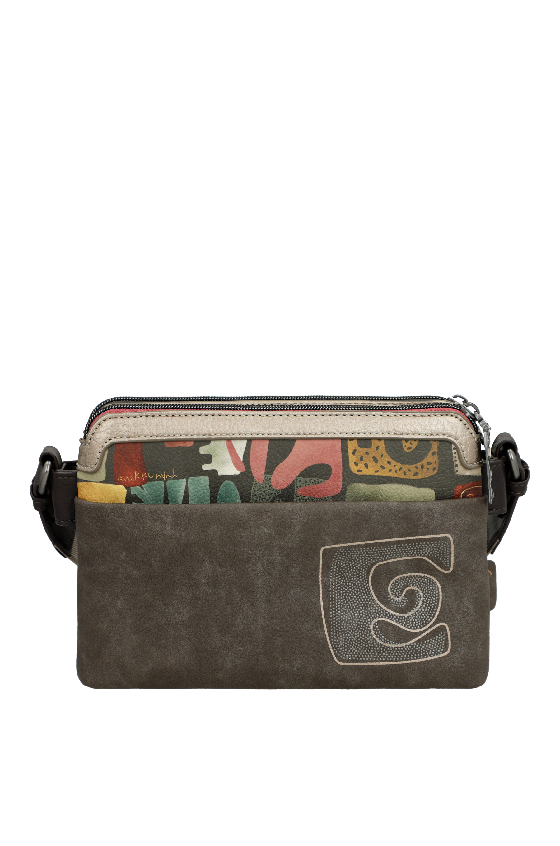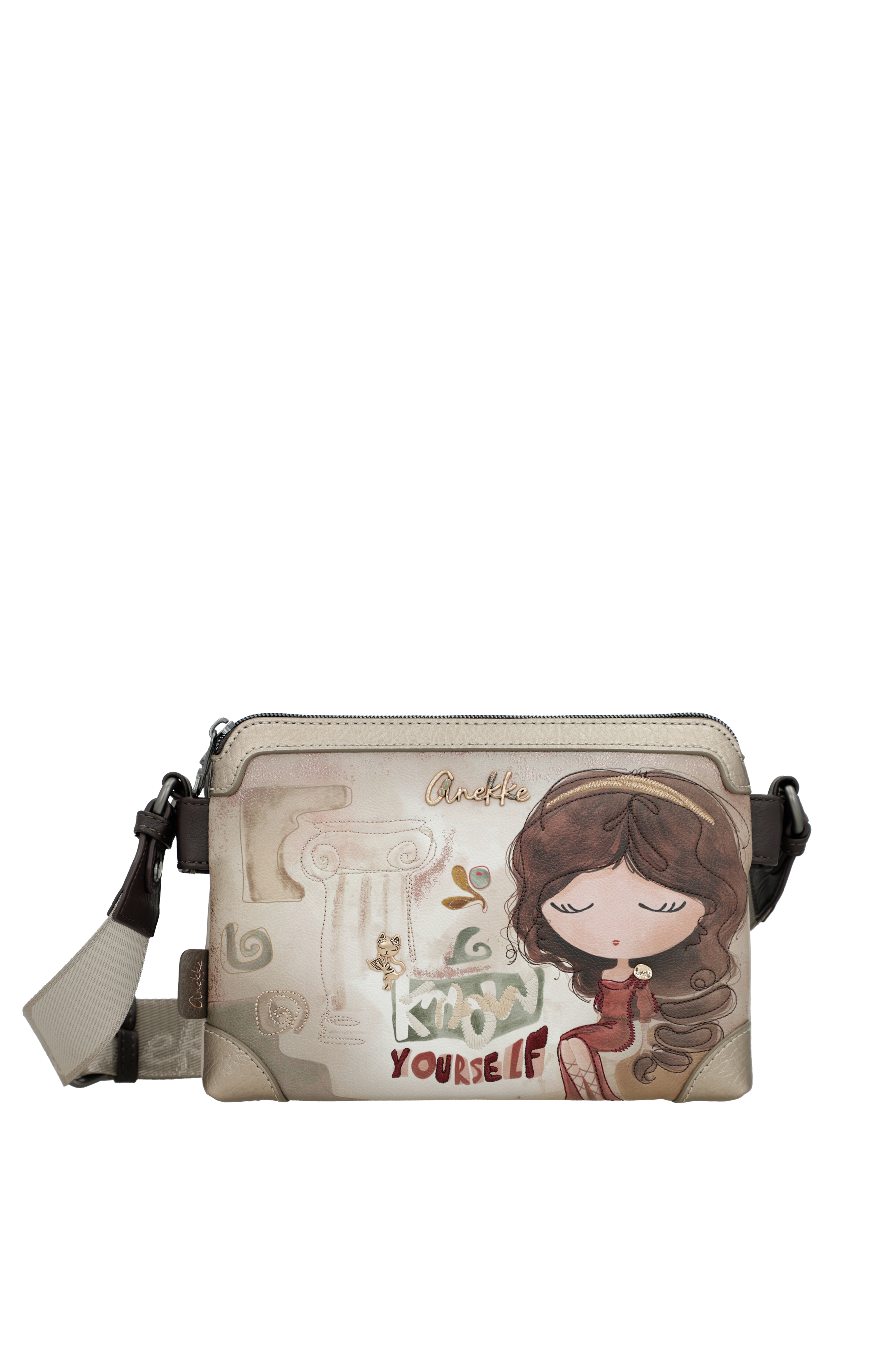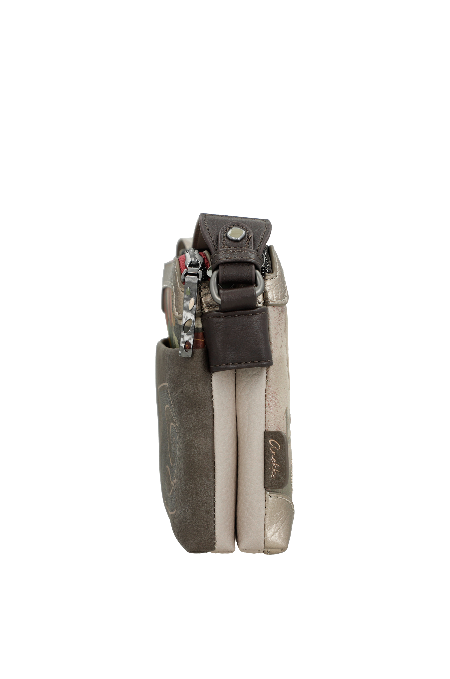 Borsa a tracolla Anekke Muse 42703-160. Borsa a tracolla, due ampie tasche principali chiuse da zip, con tasche interne per piccoli oggetti. Tasca posteriore chiusa da zip. Tracolla regolabile in lunghezza. Tutti gli accessori, come tiralampo e borchie, sono personalizzate Anekke